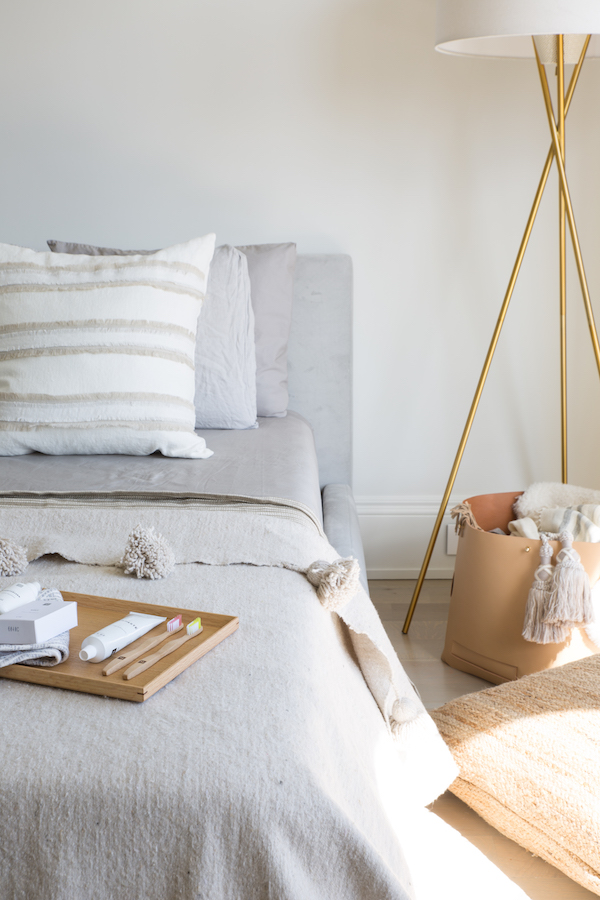 Obviously, the key to a good stay anywhere is an excellent night’s sleep. If there’s thing you should always invest in, it’s your bed. For our guest room, we went with the Wyatt bed from Room & Board in a soft gray velvet. It has a hotel bed look, which I love. And our Cocoon by Sealy mattress is already getting rave reviews. But it’s how you make your bed that will make visitors feel extra special. I’ve been a bit obsessed with the various bed making styles. My current favorite: sheets tucked in nice and tight, layered blankets folded down almost to the bed’s foot to expose all the colors and textures and then a good stack of pillows. I like just two decorative pillows for a crisp clean look.