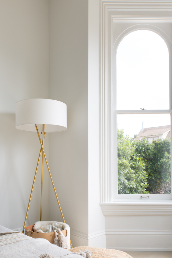 I repurposed our floor lamp to serve as a bedside light, at least for now. A basket for extra throws is always nice should your guests get cold in the night.
