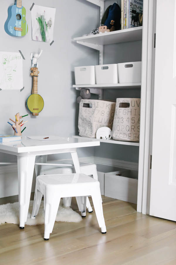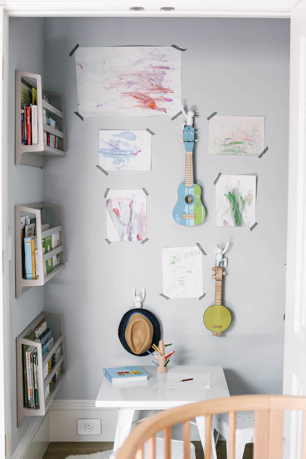 Despite my personal aversion to color, I had to pay homage to my kiddo’s creative side by displaying some of his masterpieces and his most-prized possessions on the closet wall – the banjo and ukulele. Now his instruments hang just like his music teacher’s – major bonus points for mama (though he’s probably more excited about the little men they’re hanging from then the display itself).