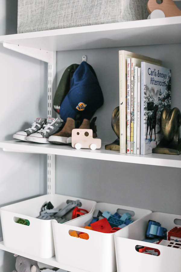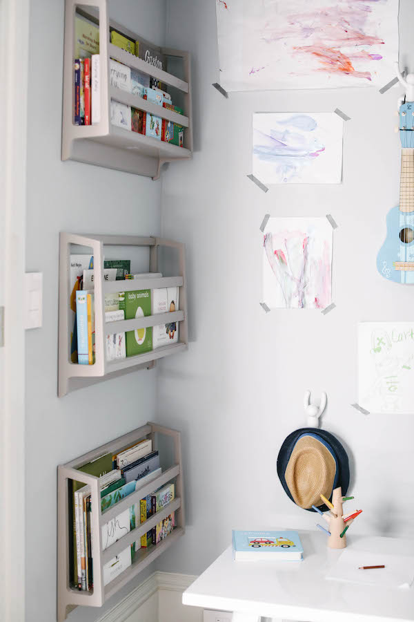 Finally, I corralled our extensive book collection with wall mounted shelves that make it easy for a toddler to recognize book covers and grab what he wants to “read” for himself. I keep the nicer titles that are less friendly to rough and tough play in the upper bin. It’s the perfect way to make use of the vertical space.