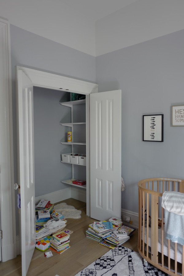 It did take a bit of elbow grease to get the closet looking this spiffy. First there was the getting rid of the things (yes, I forced myself to part with stacks of swaddle blankets and tiny baby outfits I’d been holding onto with a vice grip). Then there was the cleaning of the things. Funny how grungy a space gets when you don’t touch it for months on end!