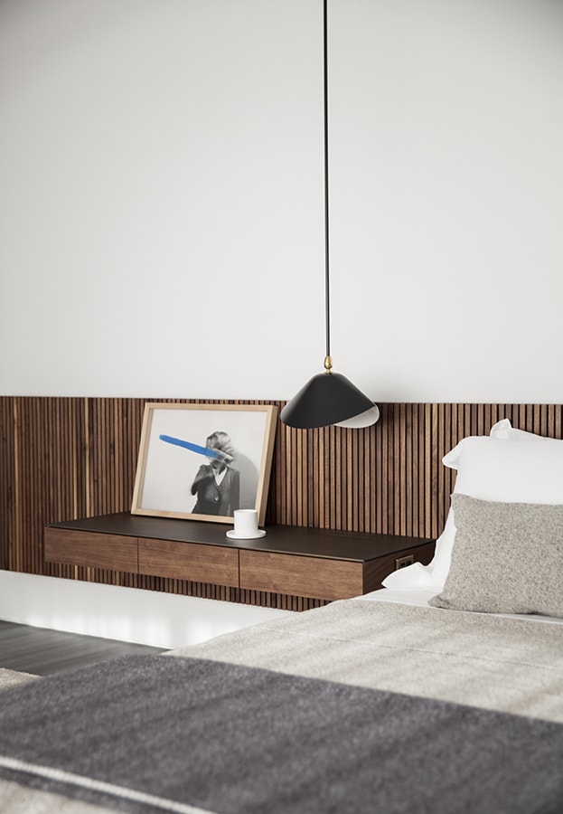 You might also call this look a bed ledge. The utility of wall-to-wall headboards are endless. It’s an easy way to inject another color, wood tone or texture to your bedroom. You can also use the wall-to-wall headboard to house bedside tables and lighting, saving floor space and keeping things minimal.