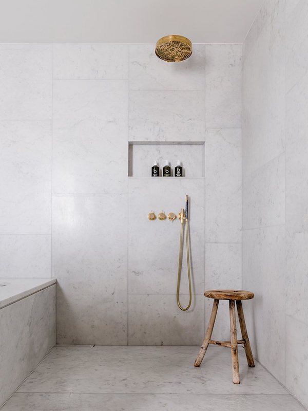 Proof that less is more (and marble is timeless) in the bathroom. The brass and rustic stool add the perfect counter balance to this space’s hyper minimal look.