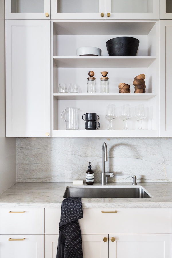 A simple, timeless kitchen is given a little punch up with that stone (which isn’t marble, but quartzite – much more manageable).