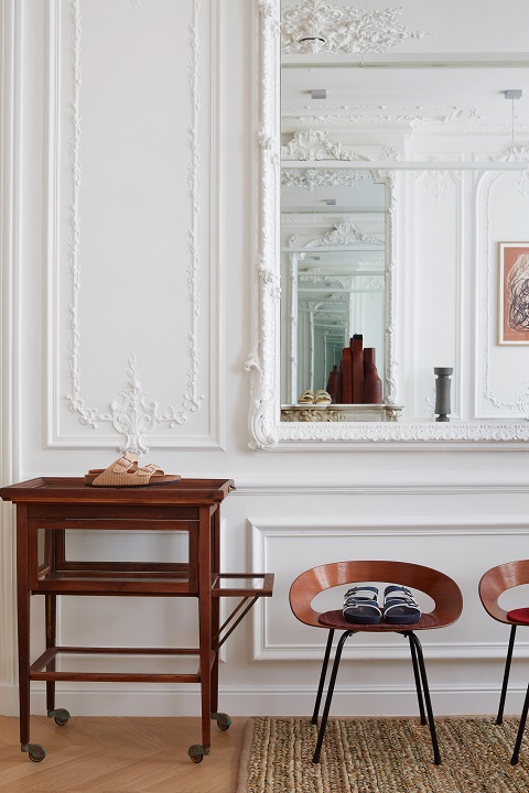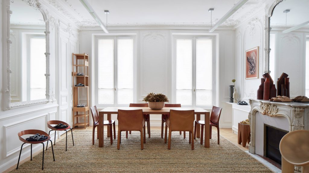Created to display Birkenstock 1774, the company’s collection of limited edition designer collaborations and special projects, the showroom is a perfect example of an idyllic Parisian apartment complete with parquet floors, paneled walls, stunning fireplaces and cascades of natural light.
