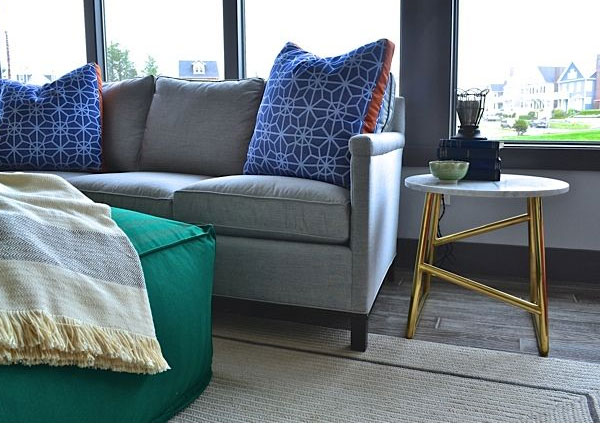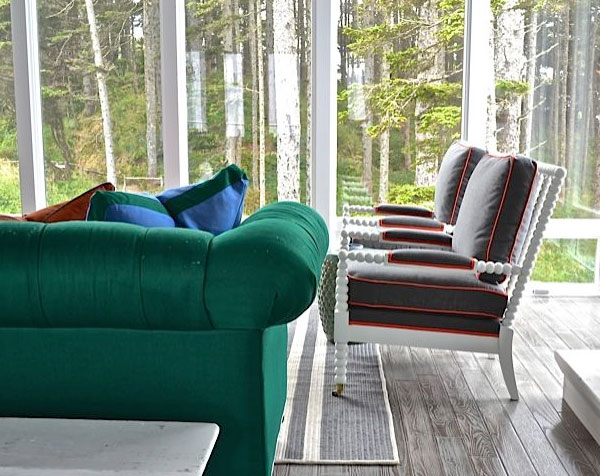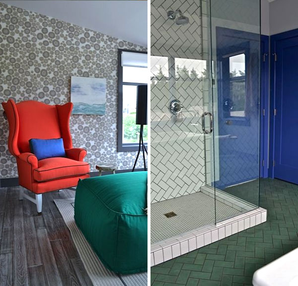 When using a bold color, use it in more than one way. For example, we can look at the true green you see throughout the project. I used it in everything from upholstery, to tile, trim paint, pillow welting and in accessories. By using variations of the green hue throughout all of those details, it makes the room look more thought out and textured.