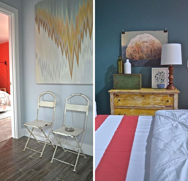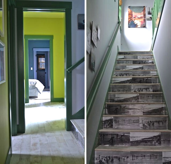 And did you notice the special project on the stairs? Brian blew up and pixelized images he found of clam diggers on the beaches just outside the homes, from the 1920’s. He then decoupaged them onto the stair risers. It’s such a fun DIY that anyone can do in their home!