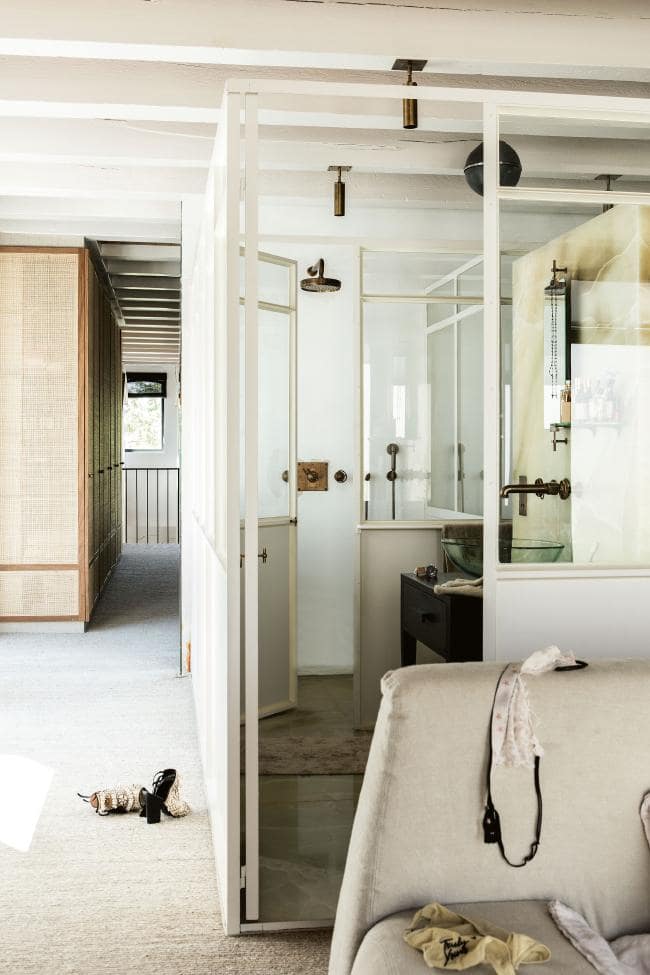 The master bathroom floats in a glass encased area in the middle of the master bedroom. I kinda love.
