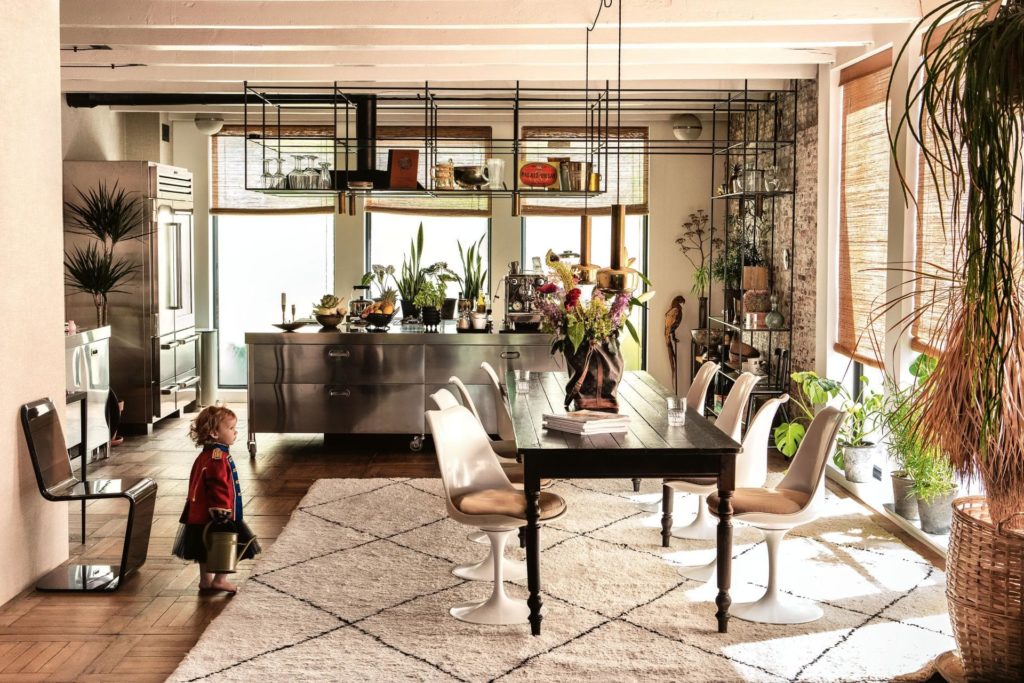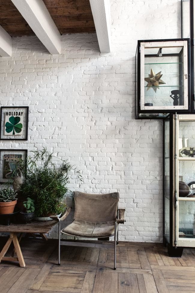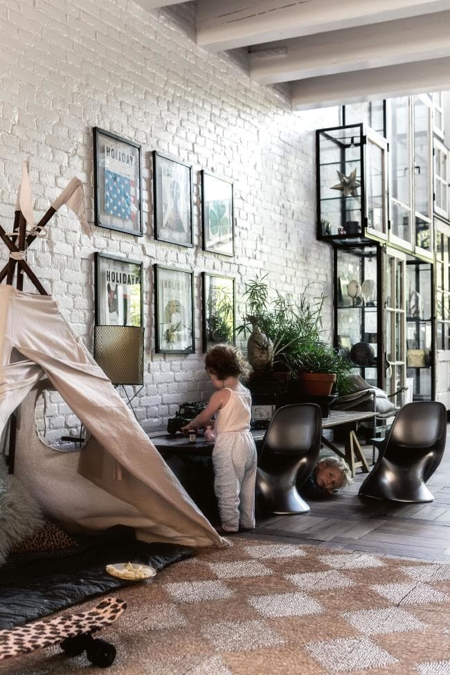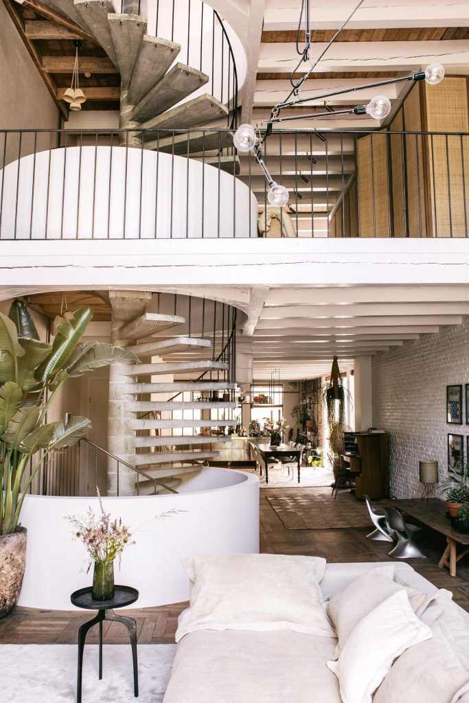 What was once a warehouse in the 1800’s, the Dutch founder of the lingerie company Love Stories, has transformed this four story building, into a funky, stylishly nonchalant family home. Rough and rustic materials from exposed beams, reclaimed parquet floors, steel windows and white washed brick mix with a menagerie of house plants, vintage furniture and pseudo-industrial light fixtures.