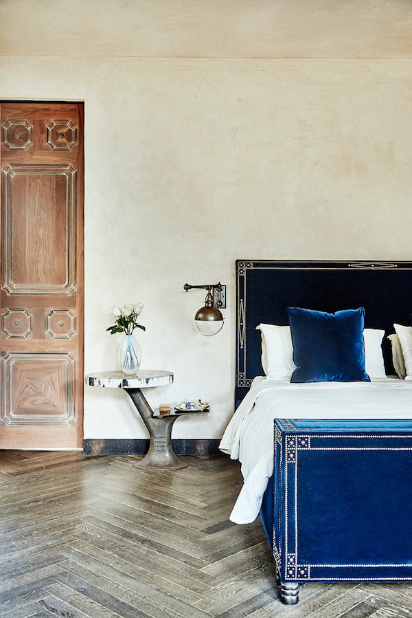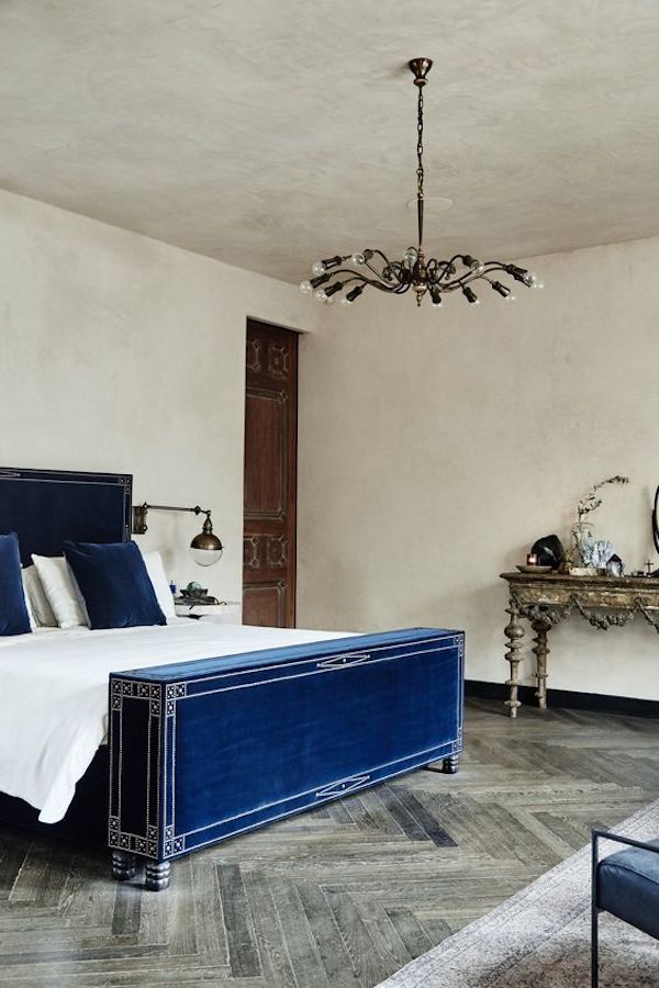 Antique doors and beautiful herringbone floors add texture and depth to the the master bedroom, as does that amazing royal blue velvet bed! But what really has me swooning as all the beautiful antique lighting.