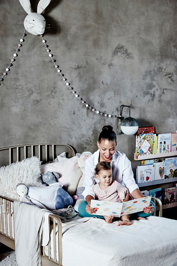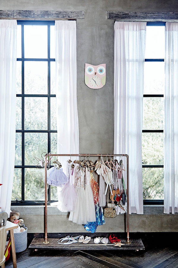 The nursery remains playful and sweet, even with what appear to be raw concrete walls and raw wood above windows. The room doesn’t feel harsh. Instead, the gorgeous collection of toys, dress up clothes and books welcome you in. It’s proof you can make virtually any interior style applicable for a child.