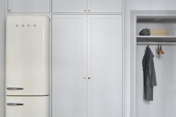 The uniform color palette continues into both the kitchen and bath. Brass accents like the cabinet pulls and pendant light give that hint of modern glam, while the creamy Smeg fridge adds a touch of vintage quirk.