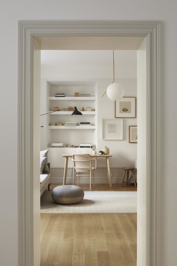 As you move through the apartment, the uniform color palette also helps it feel bigger than it actually is. The cool gray walls and cabinetry are juxtaposed with the warm, golden browns of the wide-plank oak floors, classic blonde Scandinavian furnishings and golden-hued art.