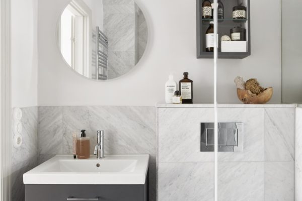 Even the marble-clad bathroom was styled with warm toned-products to connect it wth the rest of the apartment.