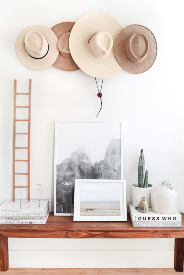 Hats as decor is another genius idea. It’s a perfect go-between while you’re waiting to build your art collection or simply need a place to store your hats. (note to self: become a hat person)