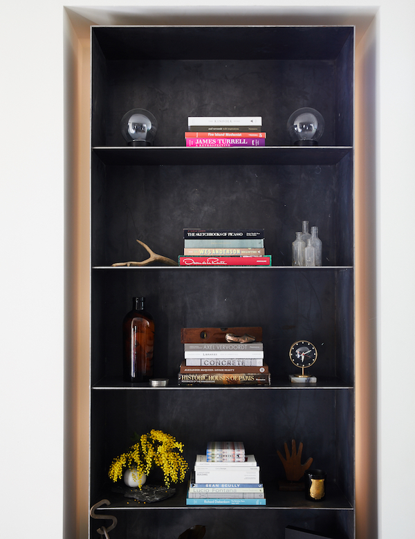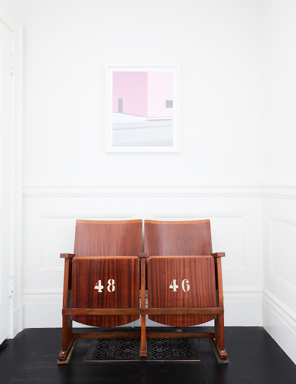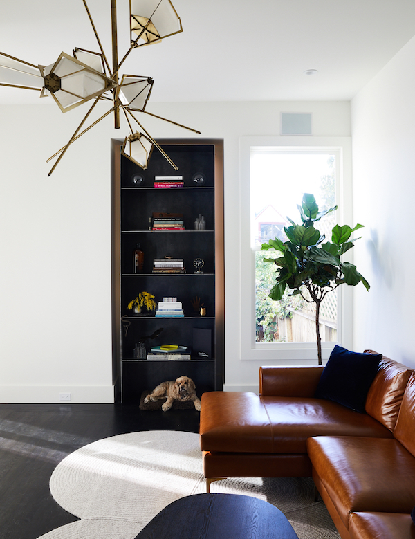If you thought you can’t seamlessly mix vintage and modern, think again. This home is a perfect example of a beautiful blend of old and new. Timeless modern classics like Tom Dixon pendants and a Saarinen table are paired with vintage french dining chairs and bar stools found at the Alameda Flea Market. In the entry a pair of theater seats sits stand guard. But rather than feel ratty, those chairs display like art against the white walls (White Dove by Benjamin Moore btw) and black floors. The juxtaposition goes as far as that epic black refrigerator with gold hardware paired with a white stove that feels straight out of the ’50s.