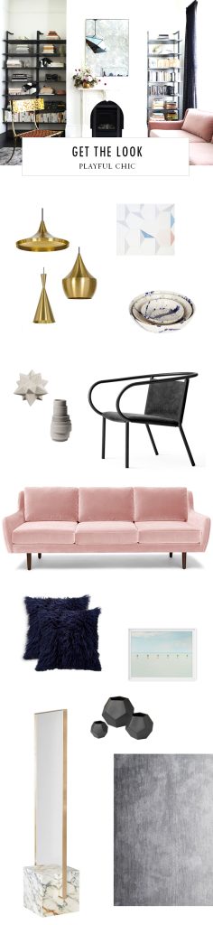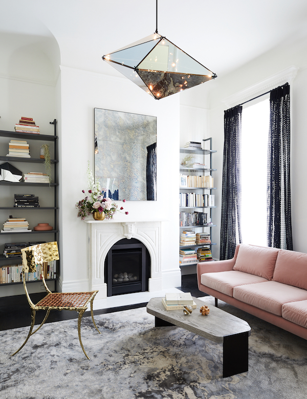 As I just discussed in this post, light fixtures can define a room – and this home’s kick ass pendants are definitely the stars of the show. But I also greatly admire the high low mix used in these spaces. While there are standout pieces like the pendant, coffee table and side chair in Susan’s living room above, she’s paired them with wall shelving from CB2 and a really affordable pink velvet sofa. But the mix couldn’t feel more right.