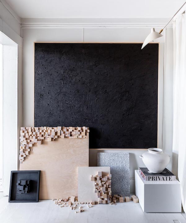 Originally from a 2,500 person town in Texas, 29-year old Dove is a painter and sculptor based in Alabama. Entirely self-taught (she began to live on her own at 17) she works in oil paints applied only with palette knives, alla the Impressionist greats. But she works in stark, minimal palates – namely black or white – and on a dramatically large scale. Many of her canvases are 9 feet or bigger. And I’m obsessed. The depth and texture to her work is just stunning.