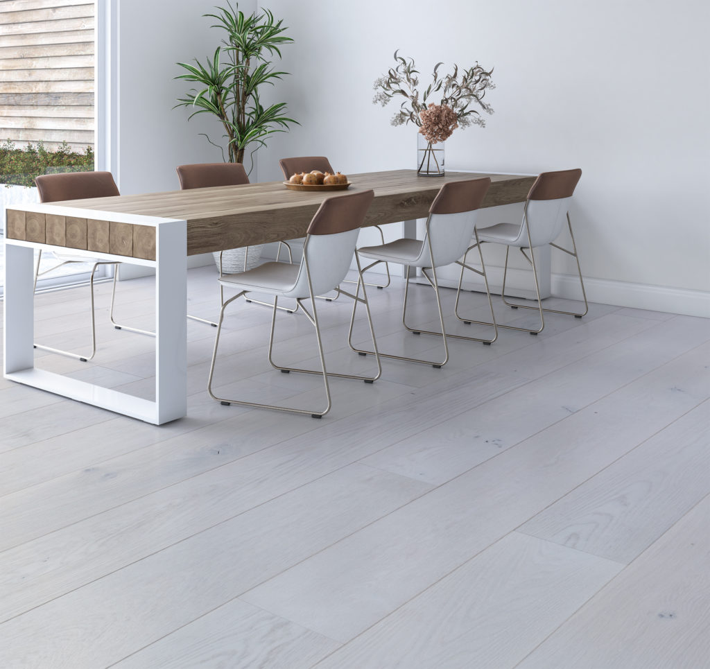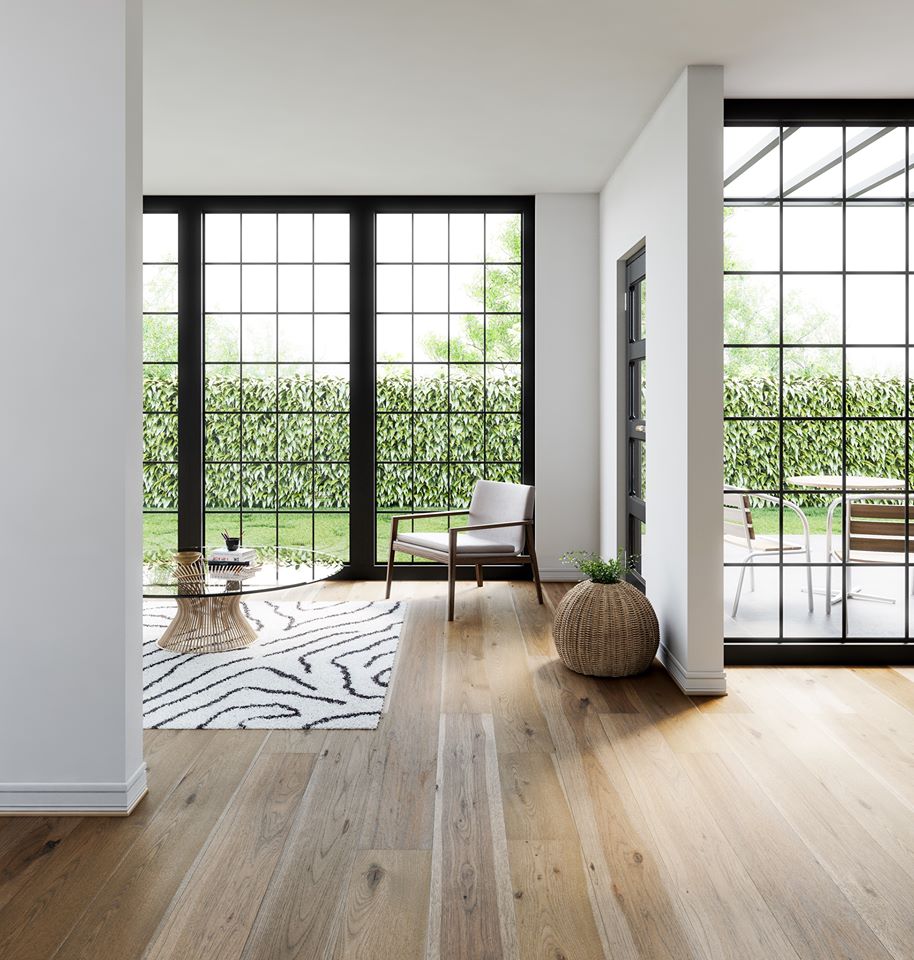A wonderful example of white oak wide plank flooring is in the stunning modern kitchen and dining space pictured above. I am obsessed with the idea of a floating kitchen – one that simply exists in the space – rather than being a room unto itself. The wide plank floors from Carlisle offer beautiful sweeping movement across the room without feeling busy or distracting.