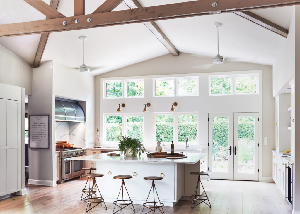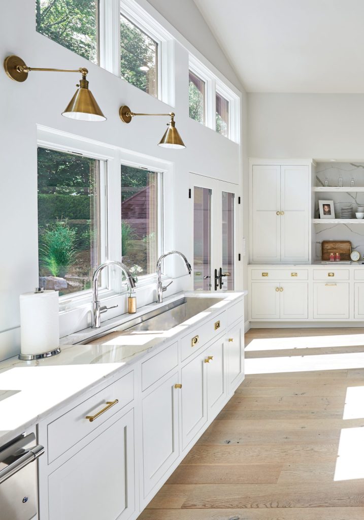 In contrast, the wide plank floor used in this kitchen offers a more casual feel to what would otherwise be a very classic all-white kitchen. The floors selected here are quartersawn, meaning they’re cut to enhance the natural grain and showcase the knots and texture found in the wood. A minimal, matte stain was used, giving the wood a natural look. The wide plank floor is the perfect complement to the modern stools, stretches of classic marble and brass hardware used in the space.