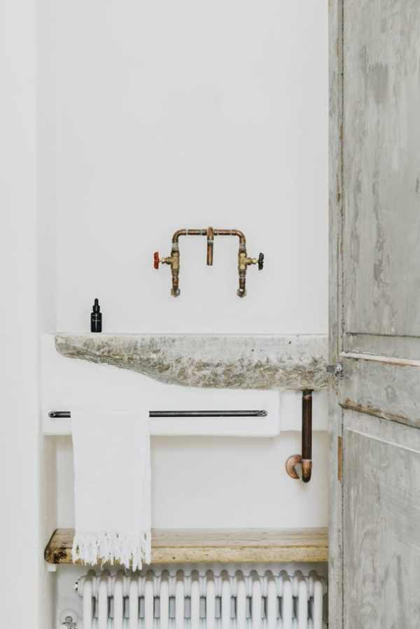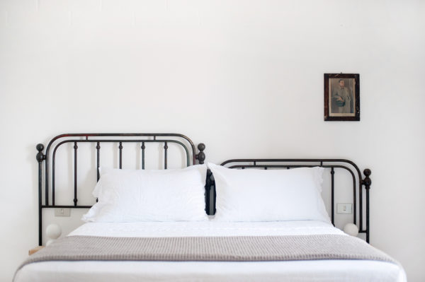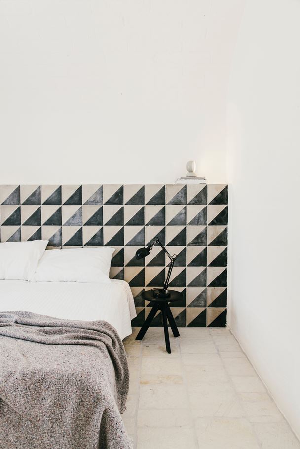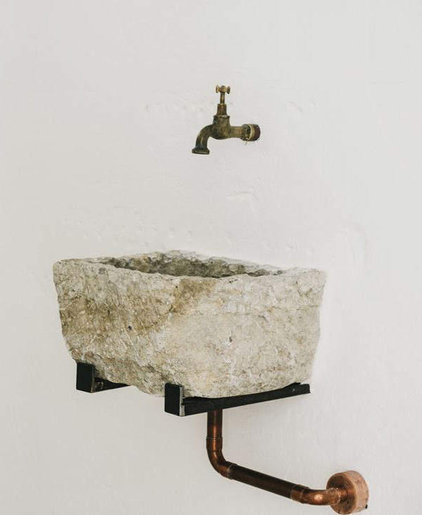 The minimal perfection is punctuated with thoughtful design moments like a geometric tile headboard in one bedroom and honed stone sinks, left rough and rugged in the bathrooms and a mishmash of antique furniture used throughout the house.