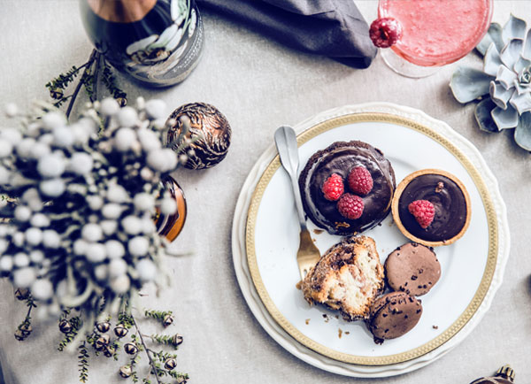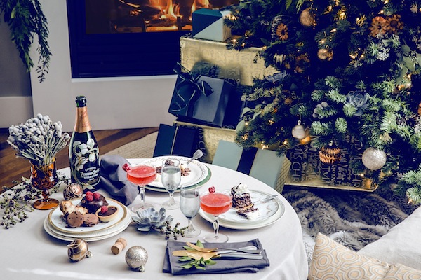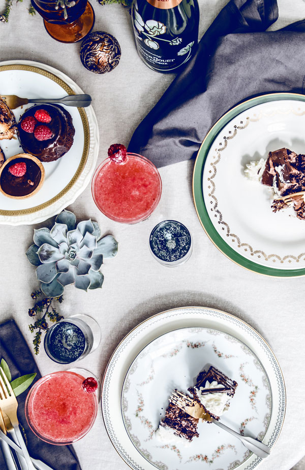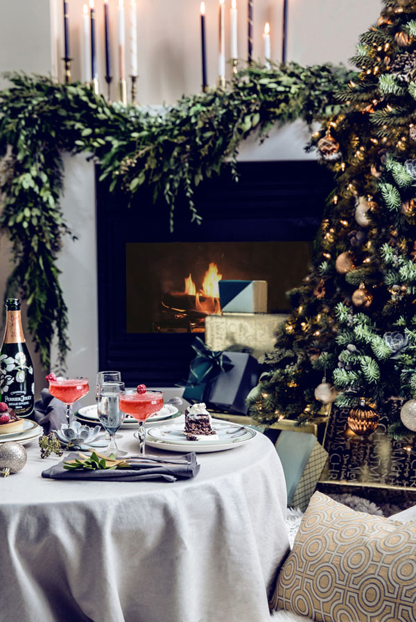 I set the scene by spreading a linen over our coffee table {I used a metallic linen for a hint of sparkle!}, laid out some chunky blankets and brought the pillows that are usually on the couch down to the floor. No fancy dinner is necessary – I would serve up a champagne-infused cocktail {our next cocktail recipe is coming soon!} with your favorite desserts {any of these delectable treats would do nicely}.