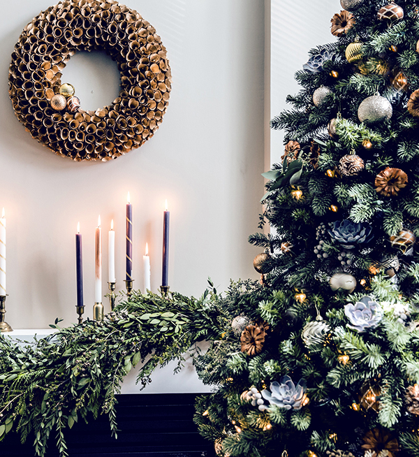 To avoid dragging endless boxes of faux garlands and Christmas baubles out of storage right before leaving for Australia, I used {mostly!} fresh trimmings, including a pine garland and even live flowers in the tree! Succulents and seasonal greens were dotted in the gaps of the tree to really amp up the unique factor. I must say, I now want to add succulents to every single one of my Christmas trees- I love their graphic shape and how their dusty color added such an interesting modern touch.
